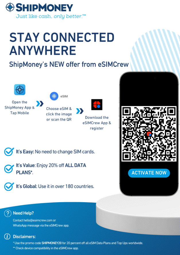 An additional option is the ShipMoney eSIM (ESIMCrew), a digital SIM that provides mobile data without a physical SIM. It can be activated on compatible devices and is useful while in port or in areas with mobile network coverage.